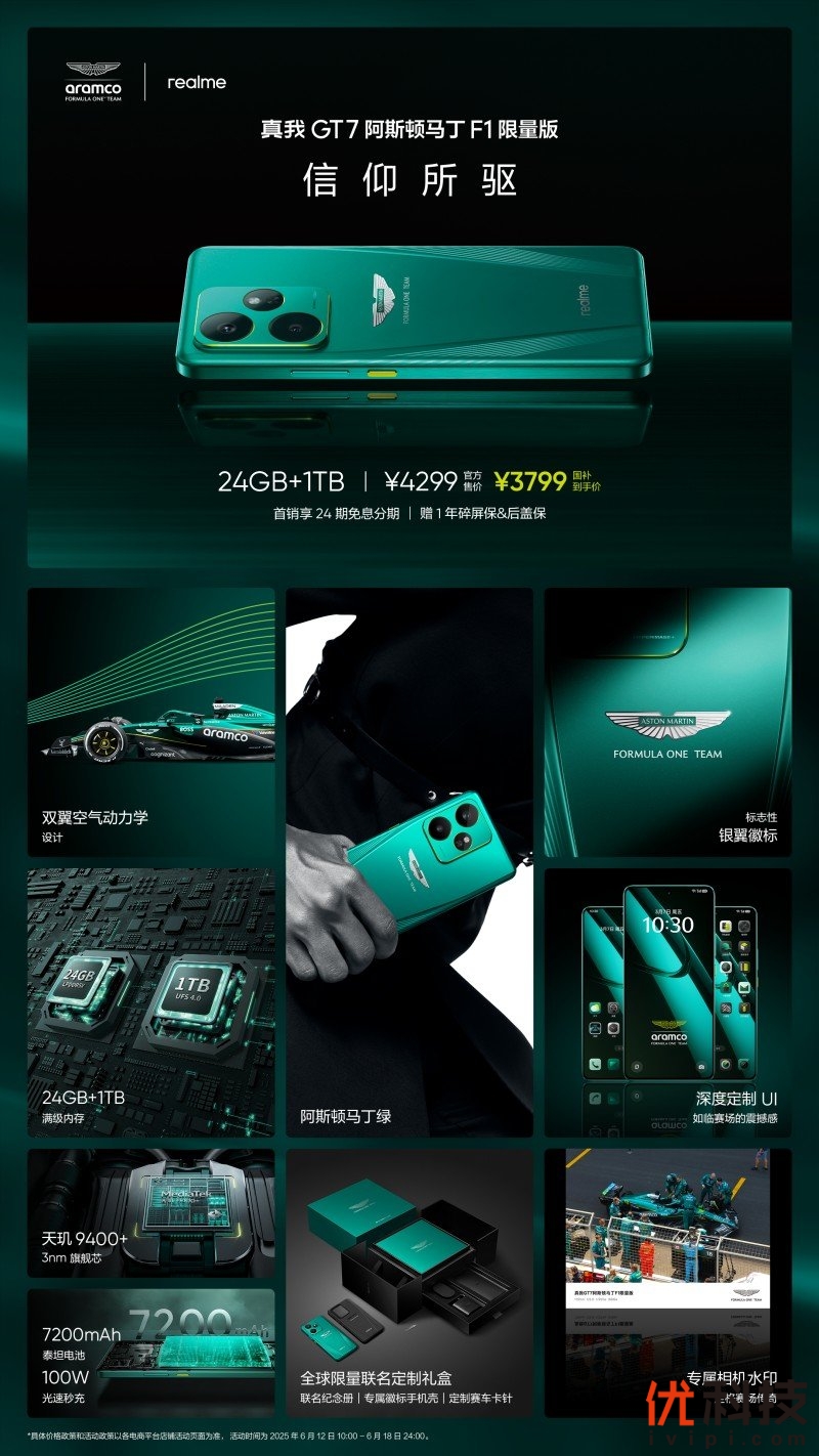 真我GT7阿斯顿马丁F1限量版现已正式开售,官方售价4299元,国补到手价3799元。信仰所驱,不负期待!让我们一同携手驾驭强大!