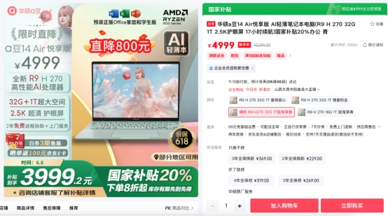 AI时代下,有人用AI辅助办公,有人用AI生成创意视频,还有人把AI当成自己的赛博朋友/恋人。今年618大促,与其选择一台千篇一律的高能笔记本电脑,不如入手一款高颜值“AI装备”,提升你的效率与生活品质。首推华硕a豆14 Air 悦享版,颜值出众、轻薄高能,更有双AI助手上阵,满足学习办公、娱乐创作等多场景用机需求,618大促不仅直降800元,叠加至高20%国补优惠后到手仅3999.2元。
