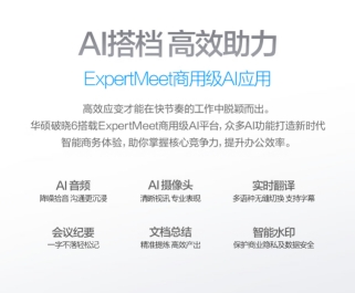 针对远程会议场景,华硕破晓6锐龙版在软件端配备了Expertmeet AI会议平台,其支持AI清晰视讯、AI降噪拾音、会议记录、文档摘要、实时翻译、智能水印等功能,能为用户提供高效沟通的会议体验。