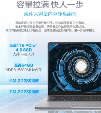 配备16G DDR5高频内存+512G PCie 4.0 SSD的存储组合,让文件加载与程序启动速度显著提升,当用户在进行大型表格处理、多标签页网页浏览,百页级PPT方案制作等场景下,系统依旧保持稳定疾速响应。