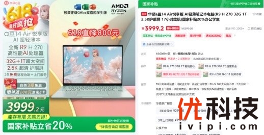 无论你是即将步入大学校园的高考生,还是刚踏入职场打拼的毕业生,不妨趁着这波618大促,入手一台好看又能打的笔记本电脑,助力新阶段自我提升。首推华硕a豆14 Air 悦享版,拥有轻薄时尚机身、强劲性能和双AI助手,满足年轻人对颜值、性能和智能的三重需求!618大促购机不仅直降800元,还能叠加至高20%国家补贴,32GB版本到手价仅3999.2元,拿下你的专属高颜高能AI拍档!