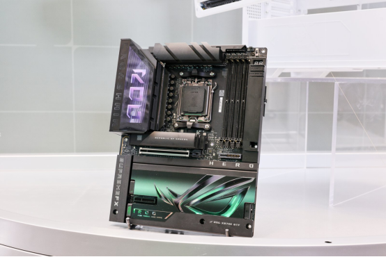 现场ROG展台还特别展示了首款AMD平台ROG背置主板——ROG CROSSHAIR X870E HERO BTF。拥有背置接口设计和背置显卡供电插槽,提供600W+电能,减少正面线材,美观易理线,小白装机轻松上手。近乎全覆盖的金属装甲,加上Polymo动态灯效2.0,让颜值再提升。采用18(110A)+2(110A)+2供电模组,搭配混合双模超频,轻松驾驭AMD锐龙9000系处理器。再度给大家扩充BTF背置系列产品阵容,满足大家所需。