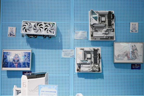 ROG玩+乐园还有备受广大二次元玩家喜爱的天选区,这里的天选全家桶主机同样引人注目,位于其中的华硕B860天选主板身披超大面积月光银散热装甲,搭配魔幻青专属配色和钻切工艺的TX LOGO,颜战双修,是打造浅色主题小主机的又一绝佳选择。板载3个M.2接口,预装一体化I/O挡板,拥有丰富的USB接口,包含USB 20Gbps Type-C接口,前置USB Type-C接口等,疾速互联,秀出高能。此区域还单独展示了天选家族的B860天选、B650E天选主板,带给二次元游戏玩家更多、更好的选择。