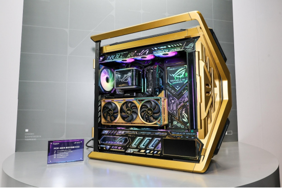 ROG创世神黄金全家桶MOD主机采用ROG MAXIMUS Z890 EXTREME主板、ROG夜神5080金色版显卡和ROG创世神金色MOD机箱,吸引众多玩家驻足欣赏。作为至尊板皇,ROG MAXIMUS Z890 EXTREME主板具备双雷电4和万兆+2.5G双有线网卡和WiFi 7。特别是全彩5英寸LCD显示屏,实时显示硬件信息和定制图案,让用户能够在显示屏上定制自己的独特风格。24(110A)+1(90A)+2(90A)+2(80A)供电模组搭配多项AI智能优化技术,为Intel酷睿Ultra200S处理器的性能释放提供保障。