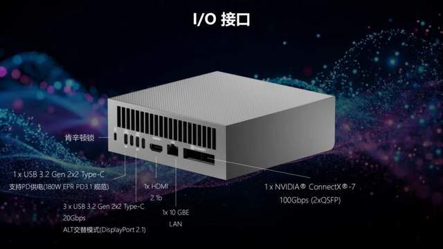 Ascent GX10采用航天级铝合金机身,纯白配色搭配顶部精密蚀刻纹理,整机尺寸仅为150 x 150 x 51 mm,体积不足1.5L,重量仅1.6kg。后置接口包括2个ConnectX-7网口、1个万兆网口、4个USB Type-C(2个支持DP视频输出)和1个HDMI 2.1接口。