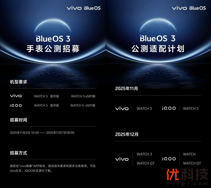 蓝河操作系统 3.0 也将逐步适配更多机型,目前已正式开启公测招募。预计 vivo WATCH 5、iQOO WATCH 5 将于 11 月开启公测,vivo WATCH 3、vivo WATCH GT 以及 iQOO WATCH、iQOO WATCH GT 将于 12 月陆续启动公测。