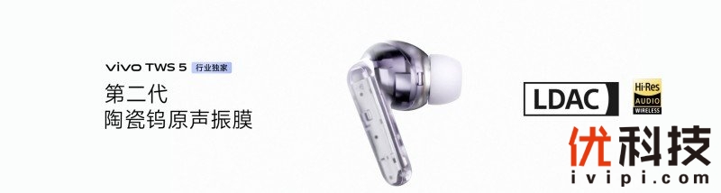 vivo TWS 5 升级到第二代陶瓷钨原声振膜,采用 4 重纳米镀层,具备高刚性和弹性特性,能够获得非常好的瞬态、灵敏度及瞬态响应,频响范围达到 16Hz~48kHz,细节表现更丰富。同时 vivo 金耳朵声学团队与上海音乐学院声学大师团深度共创, 基于第二代陶瓷钨原声振膜优秀的声学基础,从声学结构到音频算法进行全方位精准调校,突破性地平衡了 TWS 5 声学指标与艺术主观听感。经过双方的深度调优,vivo TWS 5 的全频段能量被充分释放,从澎湃低音到清脆亮丽的高音,都能原声再现,获得了 Hi-Res Audio Wireless 高品质无线音频认证。