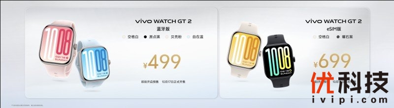 三款产品的价格方面,vivo WATCH GT 2 配色有“空格白”、“原点黑”、“贝壳粉”、“曜石黑”、“自在蓝”和“冰湖蓝”,上市价格 499 元起。即日起至 10 月 19 日,购买即赠送价值 129 元蓝白编织表带。11 月 16 日前,还可享受至高 3 期分期免息,加 9.9 元即可购买价值 49 元一年碎屏宝。