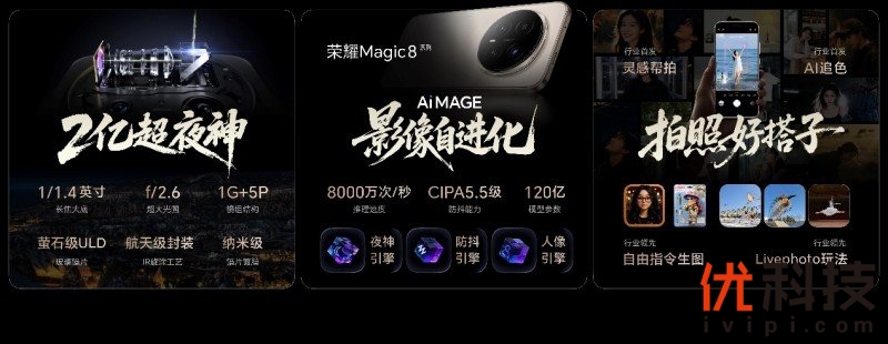 顶级影像硬件配置之外,全新荣耀AiMAGE影像系统也带来了荣耀Magic8系列影像表现进化。AiMAGE·夜神引擎,拥有8000万次/秒推理速度,精确处理明暗复杂光影;AiMAGE·防抖引擎,大幅提升陀螺仪和马达等硬件工作精度,荣耀Magic8 Pro主摄和长焦实现了CIPA 5.5级防抖能力;AiMAGE·人像引擎,高达120亿模型参数,带来肤质优化、光影还原、光斑拟真三大升级,无论日夜,都能拍出大师级人像效果。
