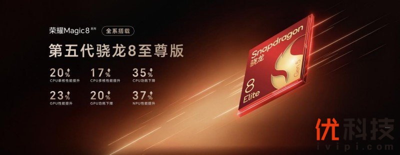 荣耀Magic8全系搭载年度最强旗舰芯片第五代骁龙®8至尊版,CPU、GPU和AI算力相比上一代都有大幅提升,性能跑分具有领先跨代表现。荣耀与高通自2022年成立了联合实验室,共同深耕新一代AI与芯片底层技术,针对芯片的各个模块定制专属优化引擎,实现超高芯片使用率。