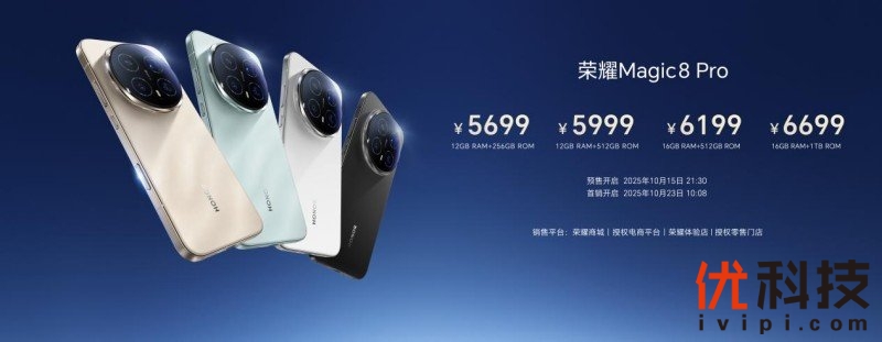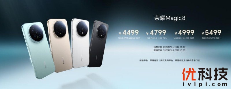 荣耀Magic8系列已于2025年10月15日正式发布,并在10月23日在荣耀官方渠道及合作平台启售。荣耀Magic8标准版配备旭日金、天青釉、雪域白、绒黑色,售价4499元起;荣耀Magic8 Pro配备旭日金砂、天青色、雪域白、绒黑色,售价5699元起。