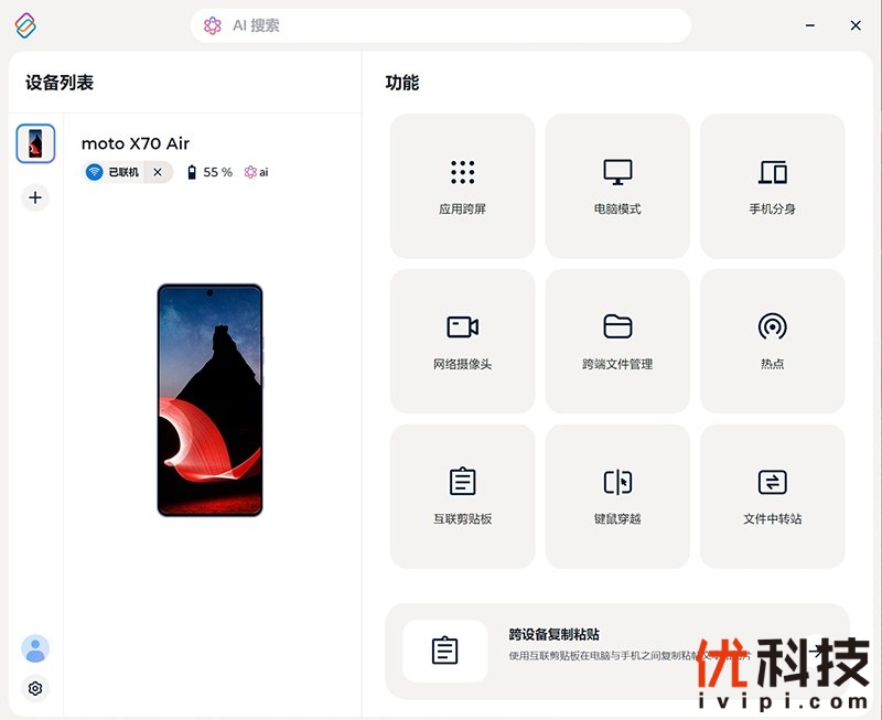 此外如应用跨屏、手机分身都是非常的好用,通过PC端即可操控手机或者运行手机端的应用程序,另外手机还可以作为PC的网络摄像头使用,而文件中转站以及键鼠穿越功能也是非常的实用,达到手机和PC之间的无缝切换使用。
