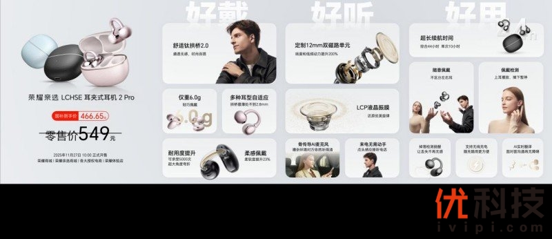 11月24日,荣耀500系列新品发布会重磅举行,正式发布荣耀亲选LCHSE耳夹式耳机2 Pro(以下简称为荣耀耳夹耳机2 Pro)。荣耀耳夹耳机2 Pro在外观设计、佩戴舒适度、音质表现、续航能力、交互体验及AI翻译等方面带来全方位越级体验,是同档位综合性能最均衡的耳夹耳机。荣耀耳夹耳机2 Pro于11月27日10:00全渠道正式开售,国补到手价466.65元。