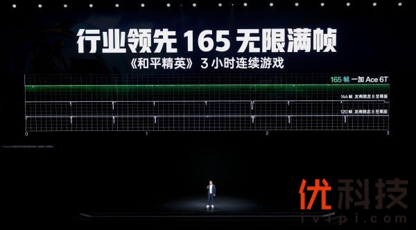 一加Ace 6T将独家自研的全新一代「风驰游戏内核」写入第五代骁龙8芯片底层,充分释放这颗芯片全部性能,大幅提升游戏表现。在风驰游戏内核的加持下,一加 Ace 6T可以轻松驾驭 165 超高帧游戏,实现同档唯一 165 无限满帧游戏体验。相比主流手机的120帧,一加Ace 6T的165 超高帧游戏每秒画面显示数量多45帧,画面显示速度提升27%,全链路操作时延缩短10ms,每秒操控速度提升17%,操作响应快人一步,不仅提高了游戏的流畅性,也提高了游戏的胜率。实测显示,一加 Ace 6T连续运行《和平精英》3小时,帧率持久流畅,帧率稳定性优于同等环境下友商骁龙8至尊版机型的120帧或144帧游戏表现,且在1% Low帧表现上也做到引领。