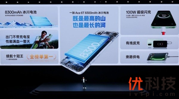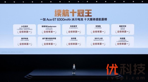 一加 Ace 6T配备8300mAh 超巨量冰川电池,支持100W超级闪充,是行业中唯一兼具8300mAh 电池和百瓦闪充的机型,续航实力异常强悍,霸榜10大专业科技媒体续航实测榜单榜首,成为当之无愧的“续航十冠王”。