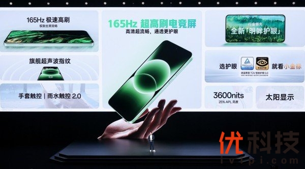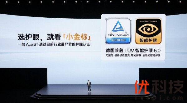 一加 Ace 6T搭载同档唯一165Hz超高刷电竞屏,带来极致高刷流畅体验,护眼能力同样出众。一加 Ace 6T 携手浙江大学、视觉健康全国重点实验室,带来了全新一代医显共研的全新「明眸护眼」,通过硬件级低蓝光、类1nit超低亮显示、3840Hz 超高频PWM 调光,有效缓解因蓝光辐射、屏幕晃眼、频闪伤眼导致的视觉疲劳,同步搭配AI距离提示、AI眨眼提示、晕动舒缓显示等主动式护眼功能,并通过了行业最严苛的德国莱茵TÜV「小金标」护眼 5.0认证。一加 Ace 6T还搭载了旗舰同款超声波指纹识别技术,指纹识别精准、快捷,全方位打造旗舰级屏幕水准。