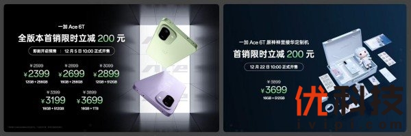 一加 Ace 6T 将于 12 月 5 日 10:00 正式开售,一加 Ace 6T原神神里绫华定制机将于 12 月 22 日 10:00 正式开售。新品开售后将登陆 OPPO 商城、京东、天猫、拼多多、抖音等平台,首批购机用户可享受以旧换新购机补贴等丰富福利。