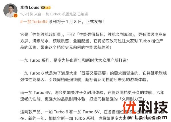 一加 Turbo 6 系列官宣定档1月8日:全面超档的性能续航超新星