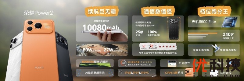 荣耀Power2打造了强大的机身可靠性,机身中框采用四角榫卯卸力设计,抗摔能力提升25%,抗弯能力提升22%,整机通过SGS金标五星整机抗跌耐摔+抗挤压认证。同时,其还具备IP68+IP69+IP69K满级防尘防水,支持超高温、超时长、任意种类防水以及10000+次反复入水无忧四重防护,即使在极端户外环境也能轻松应对。