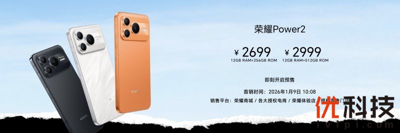 目前,荣耀Power2已全面开启预售,并将于2026年1月9日10:08在荣耀商城、各大授权电商、荣耀体验店、授权零售门店正式开售。