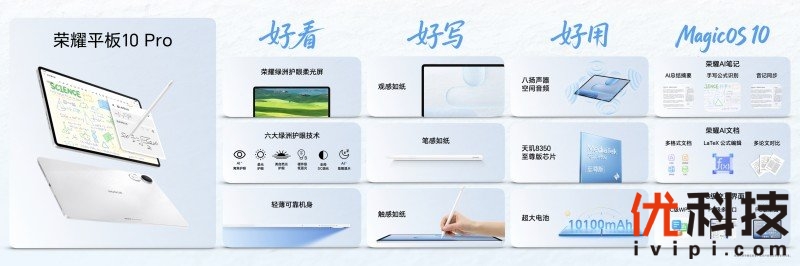 同时发布的荣耀平板10 Pro,搭载144Hz绿洲护眼柔光屏与天玑8350 至尊版芯片,机身超轻薄可靠,并且首发马年新春礼盒,内含时隔两年全新发布的“荣耀Magic-Pencil 4s手写笔”,让书写更流畅。还带来荣耀平板X10 Pro,搭载2.5K护眼柔光屏,荣耀学习空间、8300mAh超大电池等配置,提供“一块好屏,全家乐享”的视听学习体验。