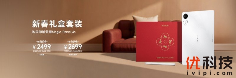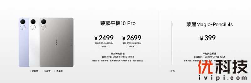 荣耀平板10 Pro于1月9日10:08全渠道正式开售,12GB+256GB标准版售价2499元、12GB+256GB柔光版售价2699元,全新手写笔荣耀Magic-Pencil 4s售价399元;此次将所有配置都升级为新春礼盒套装,12GB+256GB礼盒版现价2499元,12GB+256GB柔光礼盒版现价2699元,购买即赠荣耀Magic-Pencil 4s手写笔;荣耀平板X10 Pro于1月9日10:08全渠道正式开售,8GB+128GB版本售价1499元、8GB+256GB版本售价1699元、8GB+256GB柔光版售价1899元。