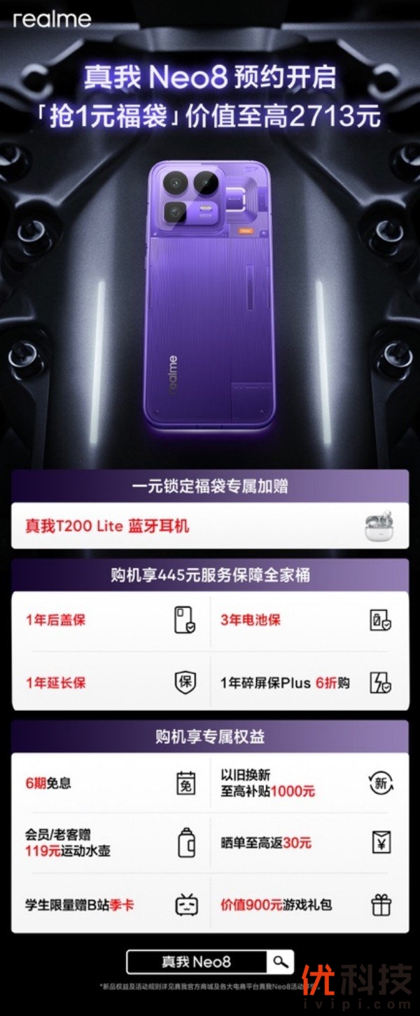 作为开年越级大作,真我Neo8集三星定制旗舰屏、第五代骁龙8、透明RGB设计与沉浸式电竞游戏体验,持续刷新同档标准。真我Neo8的新品预约已火热开启,即刻1元预约锁定加赠真我Buds T200 Lite蓝牙耳机、服务保障全家桶等至高2713元福袋,更多惊喜敬请期待。