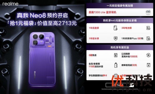 目前,真我Neo8“一元预约赢福袋”活动现已在各大电商平台同步开启。用户仅需支付1元参与预约,享至高价值2713元权益,内含真我TWS蓝牙耳机+1年后盖保+1年延长保+3年电池保等超值好礼。新一代潮玩电竞旗舰,真我Neo8将于1月22日正式发布,更多惊喜,敬请期待。
