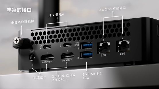 视频输出:配备双雷电4、双HDMI 2.1(可选DP接口),支持四屏4K同时输出,多屏办公、数字标牌等场景无需扩展坞,轻松拓展视觉边界。