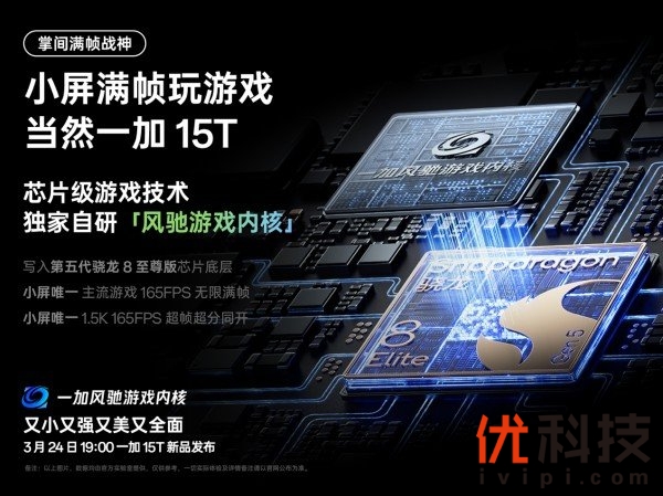 3 月 19 日,一加手机宣布全新小屏旗舰一加 15T 将搭载第五代骁龙 8 至尊版移动平台,配备独家自研新一代「风驰游戏内核」、电竞网络芯片 G2 及灵犀触控芯,带来小屏手机独一档的原生 165 帧游戏体验;续航方面,一加 15T 搭载小屏旗舰中最大的 7500mAh 超巨量冰川电池,真正实现「性能续航超越大屏」,用硬核实力诠释地表最强小屏性能巅峰。