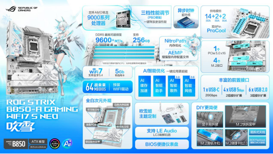 华硕ROG B850吹雪S NEO主板拥有14+2+2供电模组(80A),能充分释放锐龙9000系处理器潜力。同样加入异步时钟,可实现CPU超外频,大幅提升超频灵活性。同样拥有AI缓存加速,一键开启后可显著提升AI性能,赋能本地化AI应用高效运行。内存方面同样加入NitroPath内存优化,搭配AEMP,内存频率至高可达DDR5-9600+(OC)。板载的4个M.2接口均配备高效散热片,可有效降低温度。除了主PCIe 5.0 M.2接口配备M.2快拆装甲外,M.2_3与M.2_4的散热片也支持快拆设计,搭配M.2便捷卡扣2.0及滑轨卡扣,可免工具装卸SSD。同时板载1个前置USB 20Gbps Type-C接口、4个前置USB 5Gbps接口以及6个前置USB 2.0接口,可同时外接多个设备。网络方面同样升级至5Gb有线网口,并支持WiFi7。搭配吹雪姬主题银白易拆天线,即插即用,好看更好用。同样配备64MB大容量BIOS并预装WIFI驱动,为“战未来”做好了准备。。还有显卡易拆键,一键即可拆卸显卡,让硬件升级与维护变得前所未有的简单。音效部分同样引入新一代LE Audio技术,降低延迟,让游戏沉浸感全面提升。